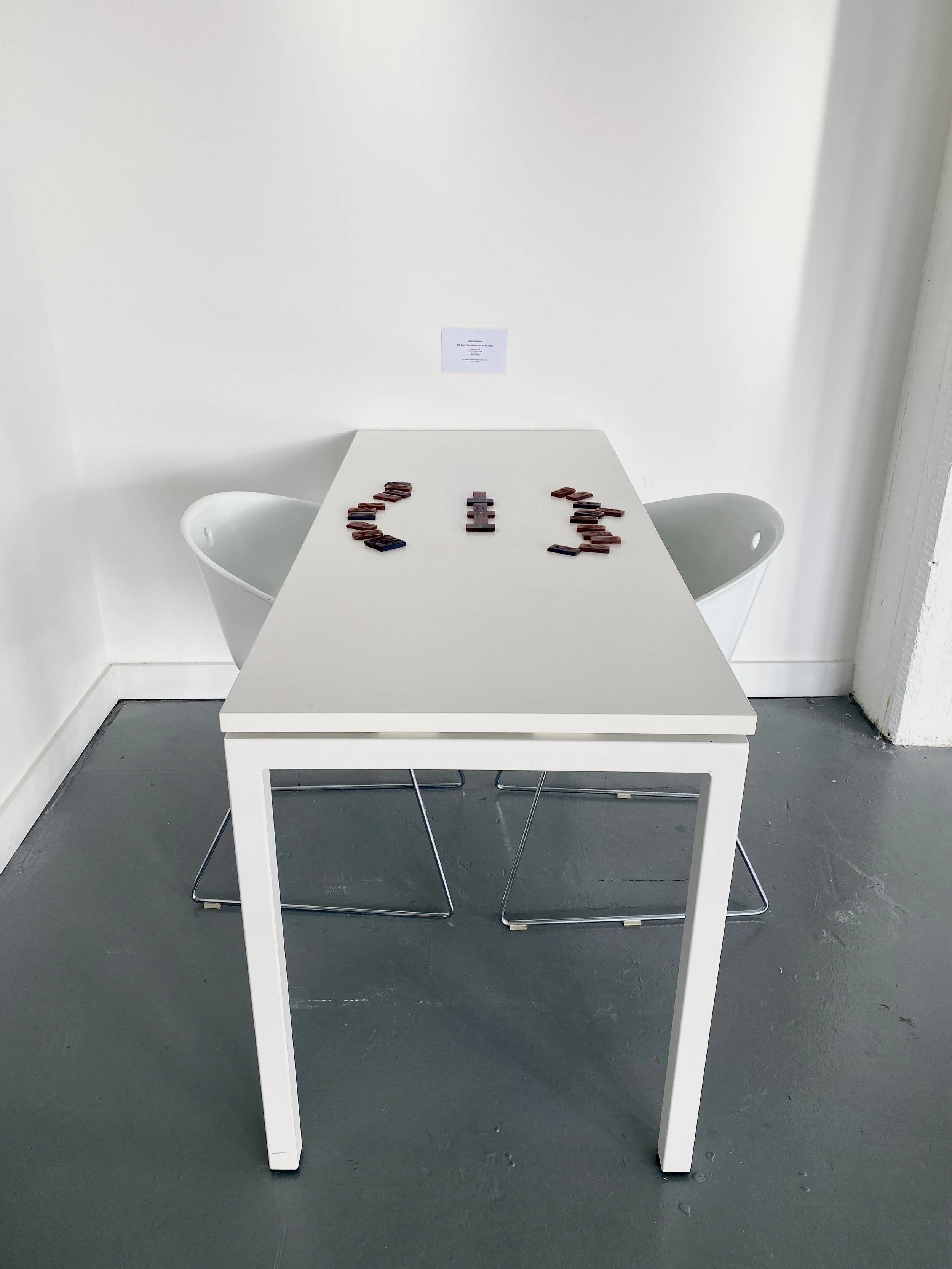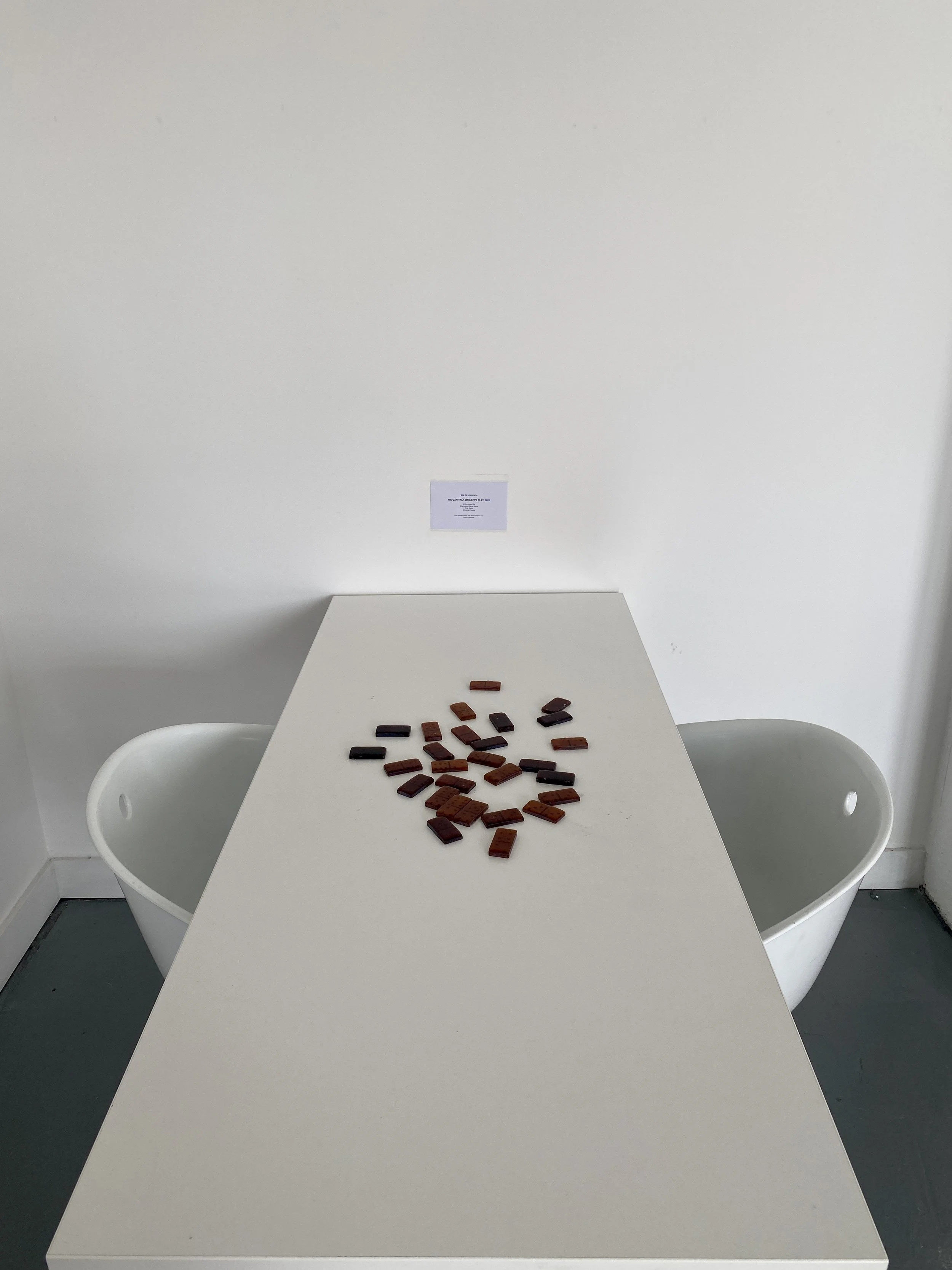 WE CAN TALK WHILE WE PLAY, is an interactive piece that invites the audience to engage in a game of dominoes, using the set cast in granulated cane sugar. This set, is an integral part of the piece, designed to be both ornament and single use functional object.